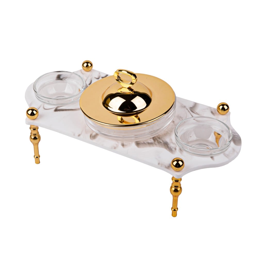 طقم ضيافة فاخر باللون الأبيض والذهبي يحتوي على 3 أوعية زجاجية و علبة مناديل