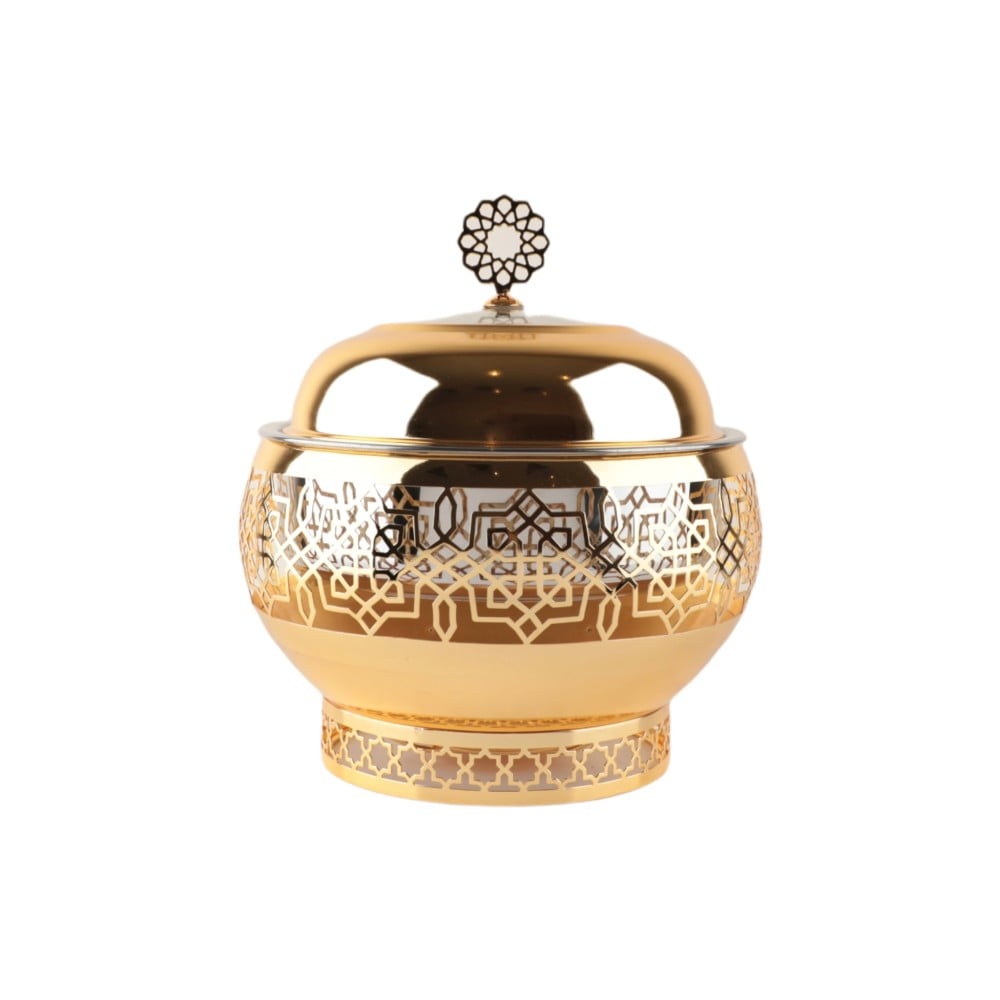 سخان طعام سولتير ذهبي 3 لتر , مصنوع من الاستيل الفاخر ذو غطاء وحامل سخّان يضمن لك بقاء الطعام دافئًا وطازجًا مدة طويلة.