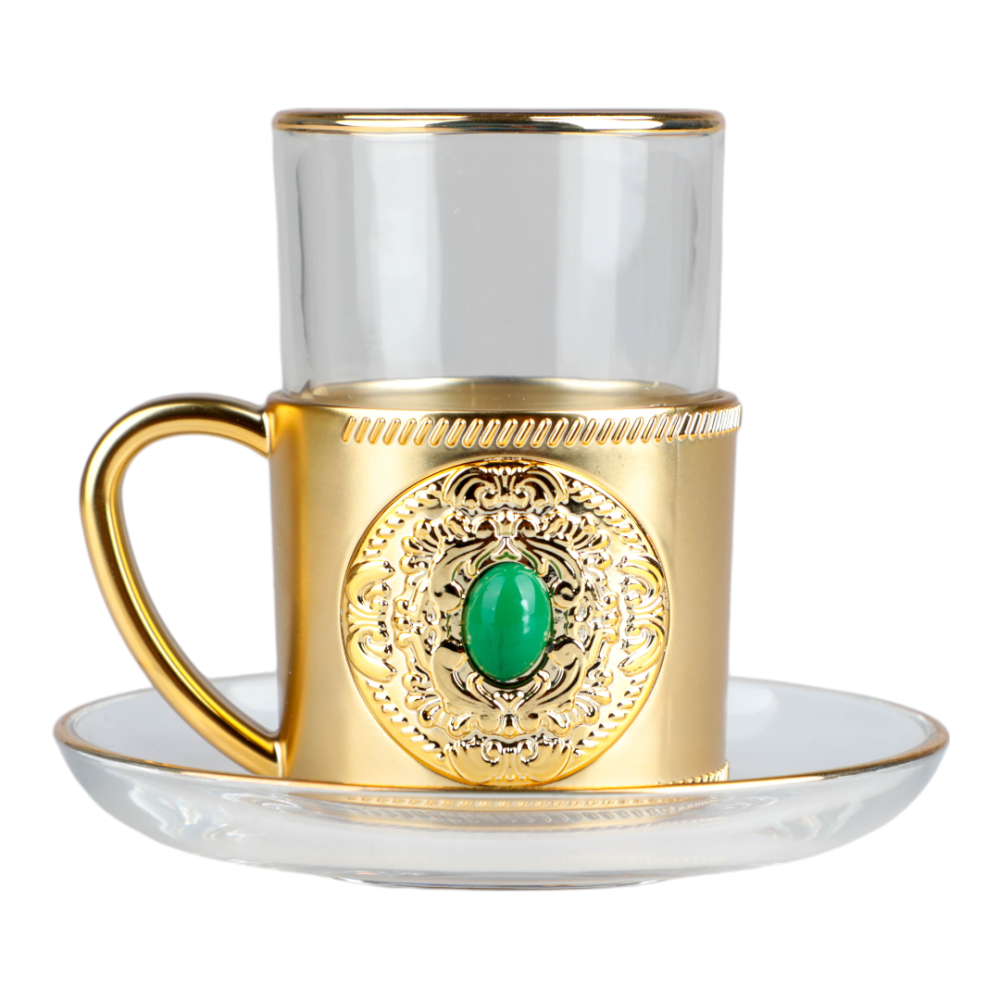 طقم بيالات شاي كوين ذهبي مطفي وذهبي وأخضر من سوليتير، عدد القطع 6 بيالات وصحون