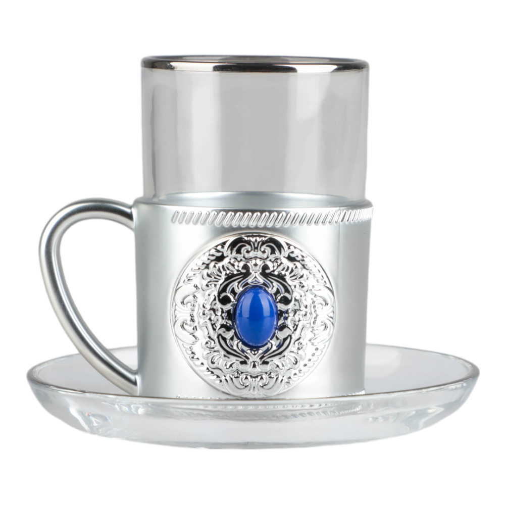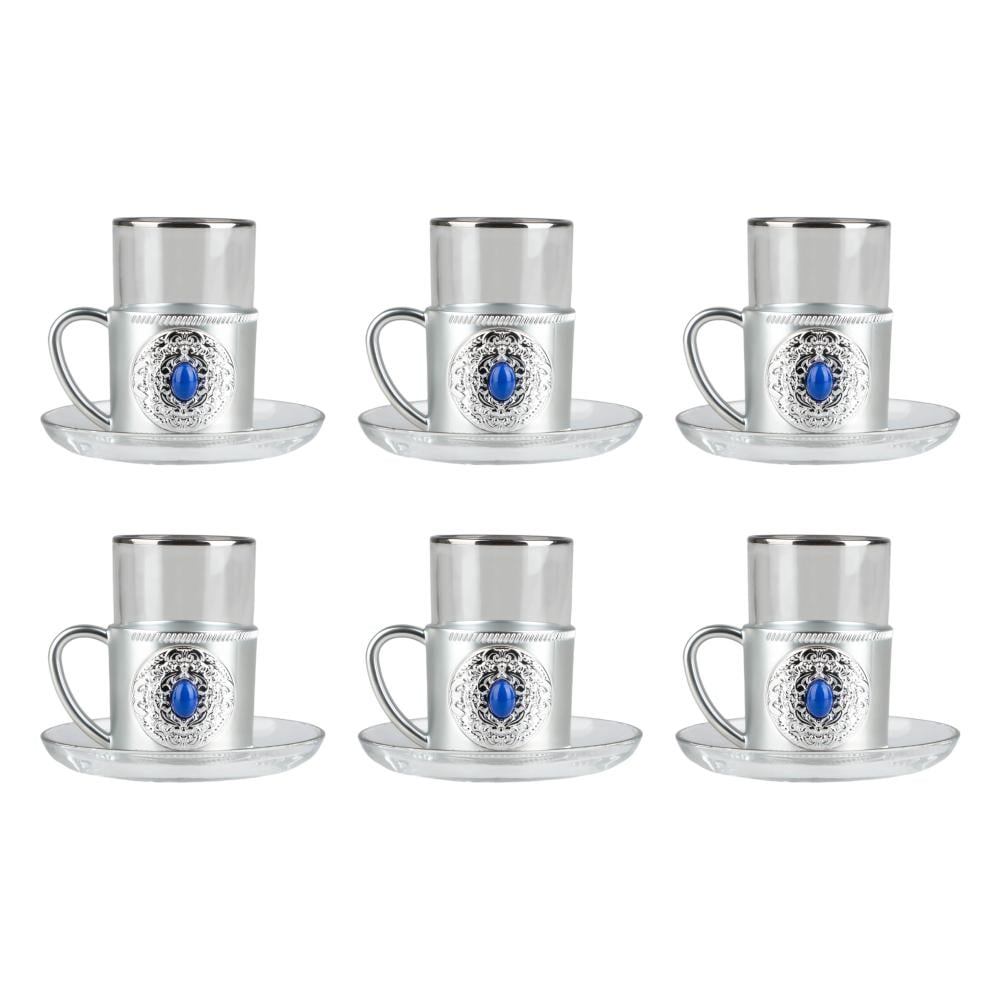 طقم بيالات شاي كوين فضي مطفي وفضي لامع وأزرق من سوليتير، عدد القطع 6 بيالات وصحون