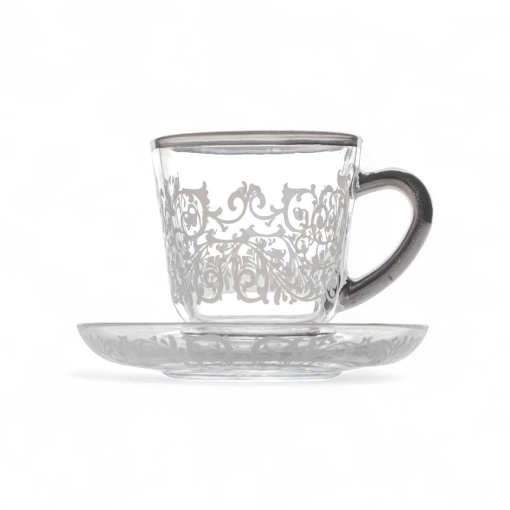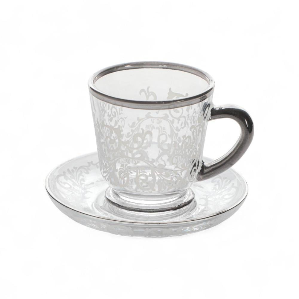 طقم بيالات شاي وصحون فاخرة من سوليتير، لون فضي وشفاف بنقوش أبيض، حجم صغير، عدد القطع 6 بيالات وصحون