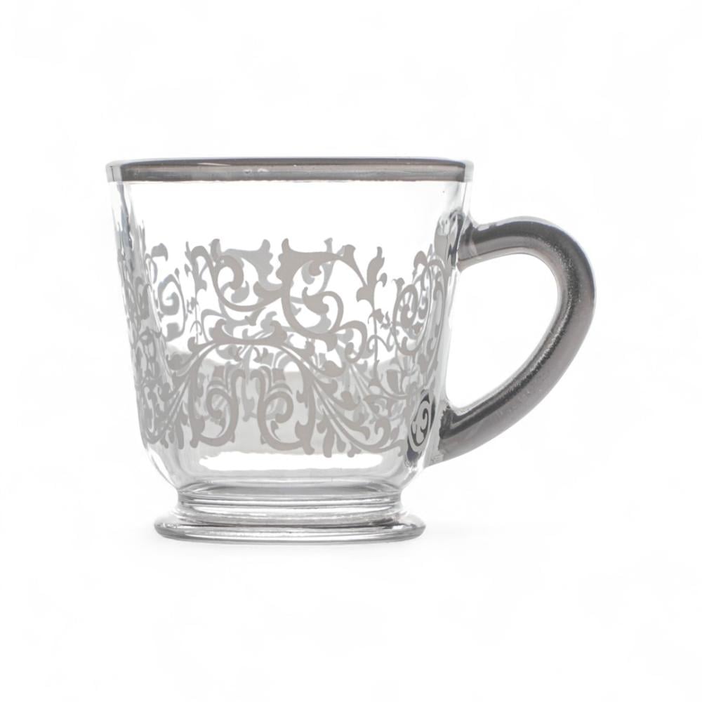 استمتعي بتناول الشاي بأناقة وفخامة مع طقم بيالات الشاي والصحون ذات نقوش فضية هذا الطقم يتميز بتصميمه الأنيق والمميز الذي يضفي لمسة من الفخامة على ضيافتك , صُممت البيالات والصحون بعناية فائقة، حيث تتميز بلون بنقوش ساحر يجعلها قطعة فنية تضفي سحرًا خاصًا على جميع مناسباتك