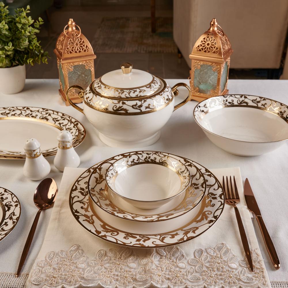 تألقي بسفرة راقية تجمع العائلة على مائدة منزلك بإستخدامك أطقم الطعام الفاخرة المصنوعة من البورسلان الذي يعطي مظهرًا أنيقًا وراقيًا على المائدة