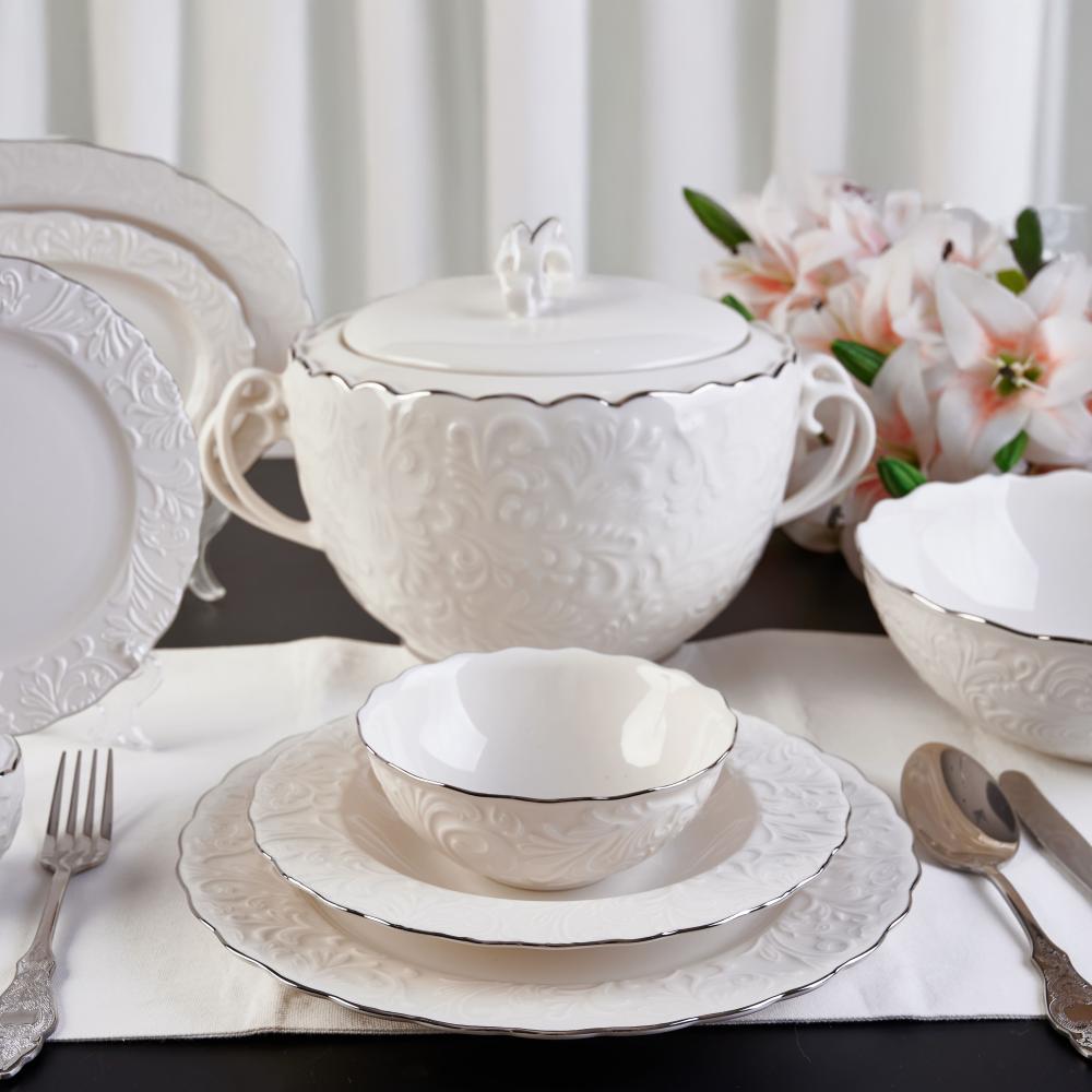 تألقي بسفرة راقية تجمع العائلة على مائدة منزلك بإستخدامك أطقم الطعام الفاخرة المصنوعة من البورسلان الذي يعطي مظهرًا أنيقًا وراقيًا على المائدة