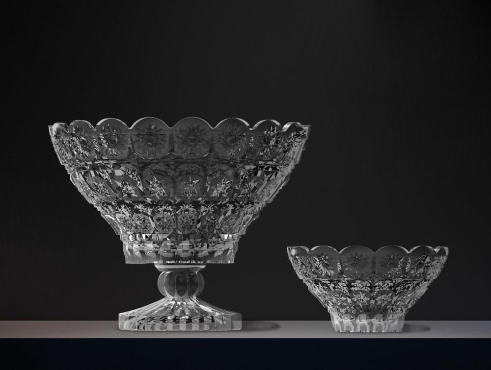 طقم كريستال مكون من 7 قطع ، قطر صحن الكريستال الكبير : 23 سم ، قطر صحن الكريستال الصغير : 13 سم ، إرتفاع الصحن الكبير : 19 سم ، إرتفاع الصحن الصغير: 8 سم